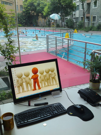 2009/7/15 办公室 36℃的温度已经让人有点透不过起来,办公室的空调似乎也有气无力的在运转着。坐在办公室中唯一感觉到一点点凉意的就是办公桌前的游泳池了,但是只有工作份的我们就瞎看看吧,这就是现实与梦想的距离,近在咫尺,却难以触碰啊。