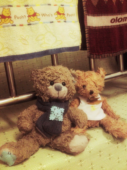 09/07/31 这两个熊已经陪伴我有大半年时间了吧,以前一直放在公司的办公桌上,虽然平时没有怎么去搭理他们,但是无形的他们还是给我带来了很多快乐哈。今天终于把他们带回家了,顺便给他们洗了一下尘,嘿嘿,刚刚出浴的熊似乎更可爱了吧。