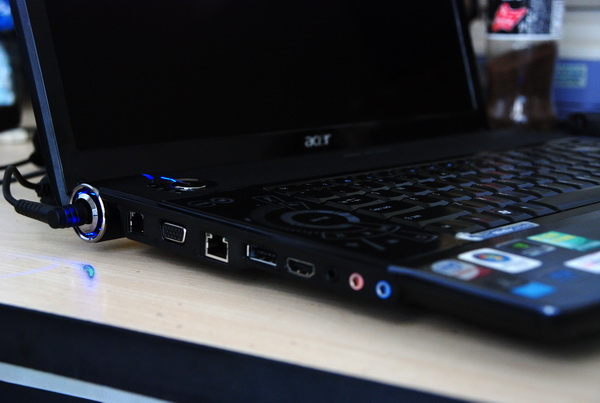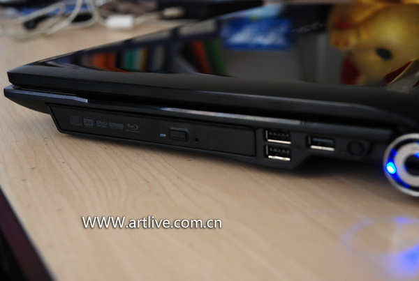 右侧面依次安排了蓝光光驱,USB接口,但是这三个USB接口过于紧密,导致稍微大一点的USB设计插进去就会影响其它的USB接口,而且由于底部是熬进去的,键盘面要稍微凸出来一点,所以上面两个USB接口基本上几乎不能接大体积的USB设备,我的联想Y910蓝牙U盘就很难牢固的插进上面两个USB接口。希望ACER设计师在以后的设计中要注意到这样的细节。