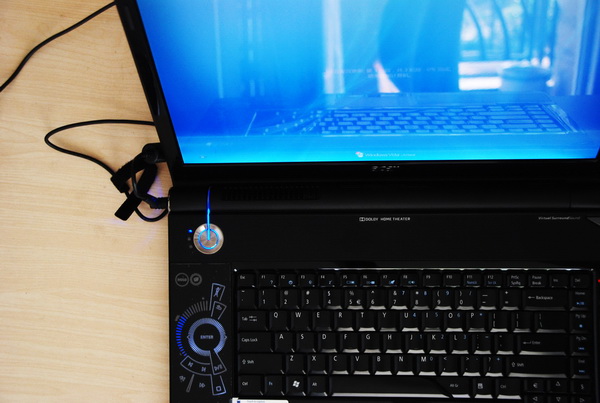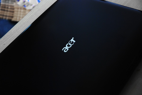 其实这个外壳是深海蓝,只是没有办法拍摄出那种感觉,外壳上面的ACER在通电后会发出白色光芒,煞是好看,这下羡慕MAC的朋友有福了。