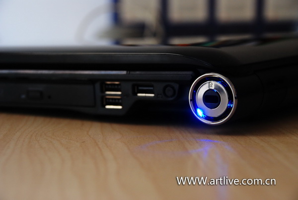 机器的左侧面接口非常丰富,AC电源插孔被非常巧妙地设计在机器转轴处,采用了亮银金属质感的设计,内嵌蓝色灯光链接上电源后感觉非常迷幻。从左只有一次排列着Modem接口、VGA接口、RJ45接口、E-Sata接口、HDMI接口、音频接口,在左前方还设置了一个红外线接收器和一个六合一读卡器,可以兼容SD、MMC、MMCPlus、MS、MS Pro、XD卡。