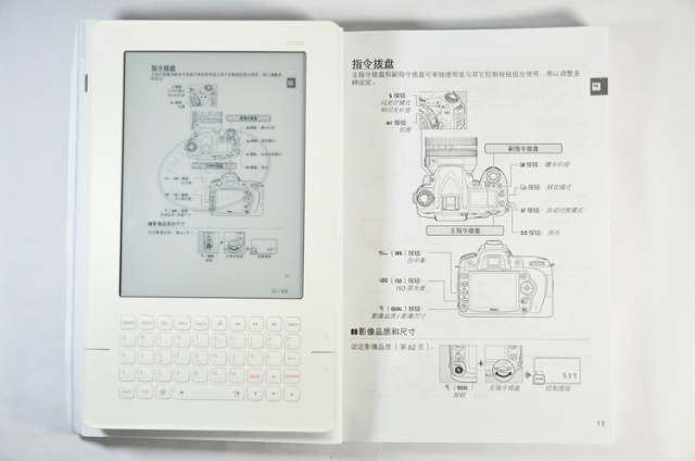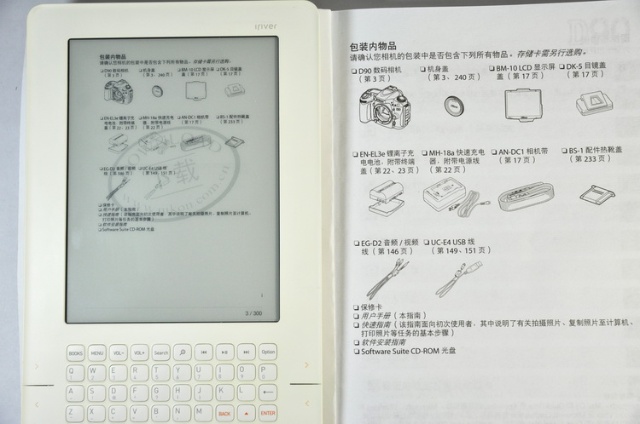 为了更好的对比iriver story显示效果与印刷书籍的区别,我在这里特意找来同样内容的书籍电子档和印刷版进行对比。使用的是 尼康D90的说明书(由于下载的电子书加密了,有个水印,各位无视哈)