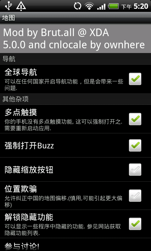 MOD版5.0地图,导航、BUZZ、3D(国外可用)全部功能都可使用: