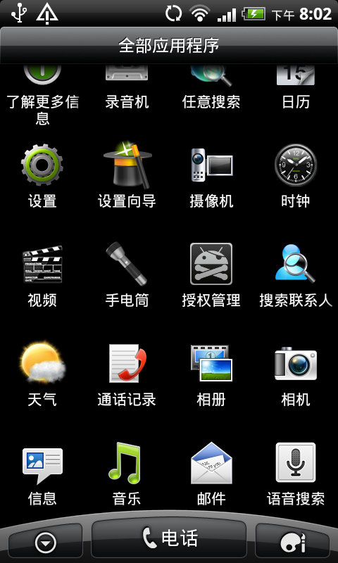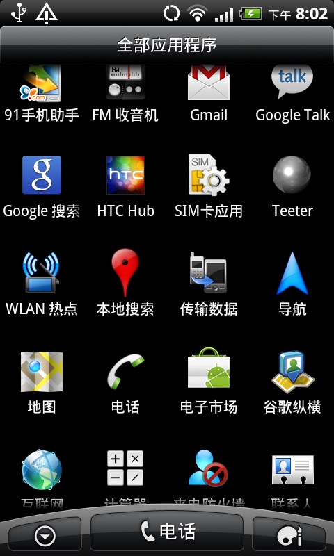 机器内所有程序,基本上全部的都在这里(91手机助手是刷机后安装的,还有“语音搜索”和“桌面时钟”两个图标没有截下来。