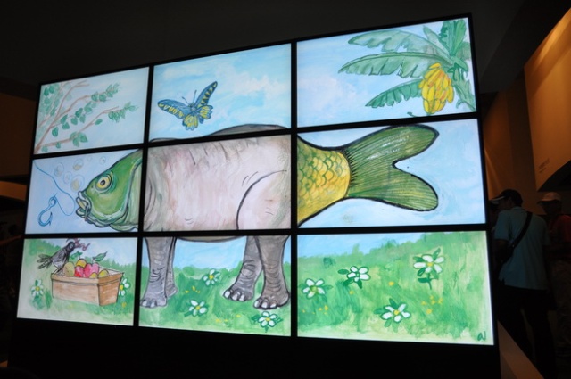 谁说牛头不对马嘴的?看看这些画面吧,就活生生的将各种动物的不同身体部分一通乱对,哈,然后就创造出来了N多千奇百怪的新物种出来,挺有趣的吧! 这是捷克共和国世博馆里面的一种图片,我只拍了其中很少一部分,你有空可以算算几种动物替换不同的位置可以得出多少新物种,估计是一个很庞大的数字吧,呵呵。