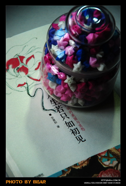 静静的,想起了很多很多,正如这瓶幸运星的牵挂,一好友叠给我的幸运星被我遗落在书桌的角落,打开尘封的瓶盖,里面的香草还散发出浓浓的香味,很多回忆立马浮现在脑中,有点叹息,有点感动,有点无奈,幸好也就如此,只若初见,没有开始,就没有结束……