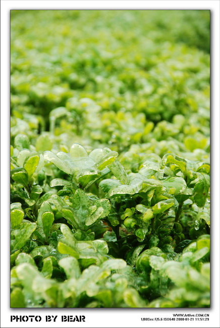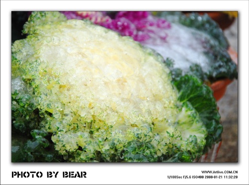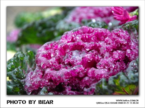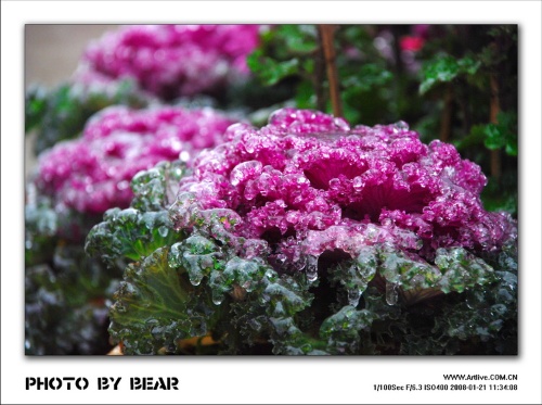 看看这些羽衣甘蓝完全被冰裹着,像是一朵朵水晶花儿。